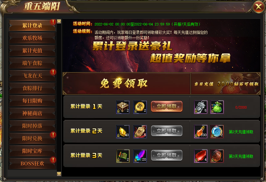 活动期间内,玩家每日登录即可领取精彩大奖!每天充值达到指定的额度,还可以领取额外一份奖励!