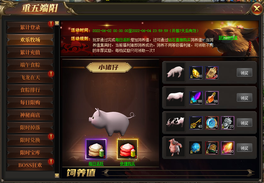 玩家通过完成每日活跃增加饲养值,还可通过钻石直接购买饲养值,当饲养值集满时,当前福利猪即饲养成功,饲养不同等级福利猪,可领取不同的丰厚奖励,每档奖励只可领取一次!