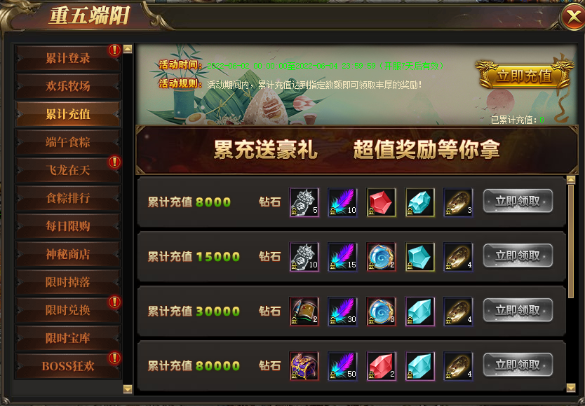 活动期间内,累计充值达到指定数额即可领取丰厚的奖励!
