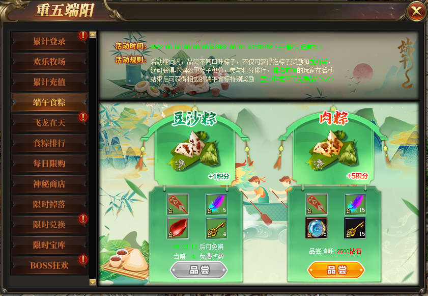 活动期间内,品尝不同口味粽子,不仅可获得吃粽子奖励和龙舟桨,还可获得不同数量粽子积分,参与积分排行,排名前30的玩家在活动结束后可获得相应的端午食粽特别奖励(豆沙粽每日可免费品尝5次)。