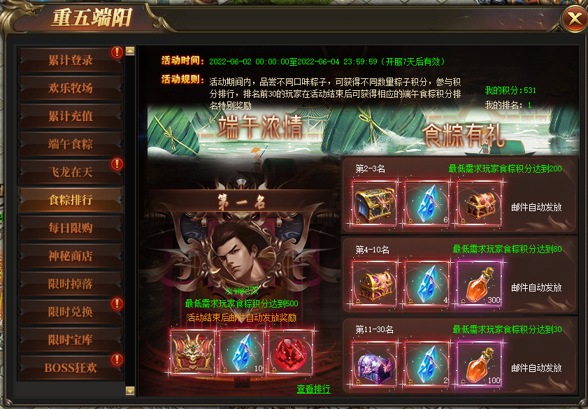 活动期间内,品尝不同口味粽子,可获得不同数量粽子积分,参与积分排行,排名前30的玩家在活动结束后可获得相应的端午食粽积分排名特别奖励