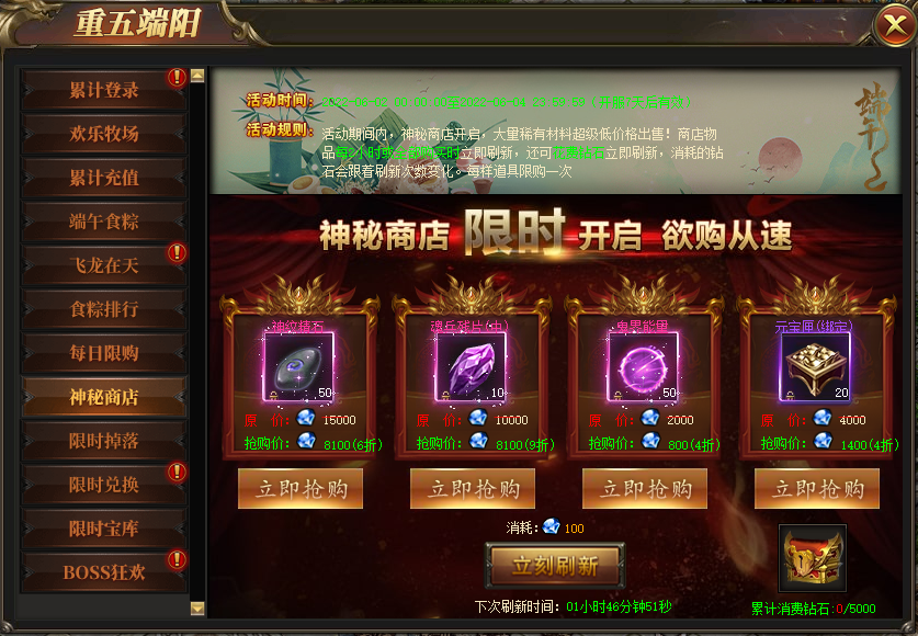 活动期间内,神秘商店开启,大量稀有材料超级低价格出售!商店物品每2小时或全部购买时立即刷新,还可花费钻石立即刷新,消耗的钻石会跟着刷新次数变化。每样道具限购一次