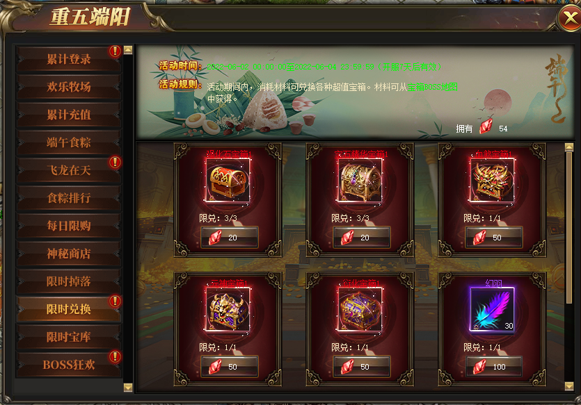 活动期间内,消耗材料可兑换各种超值宝箱。材料可从宝箱BOSS地图中获得。