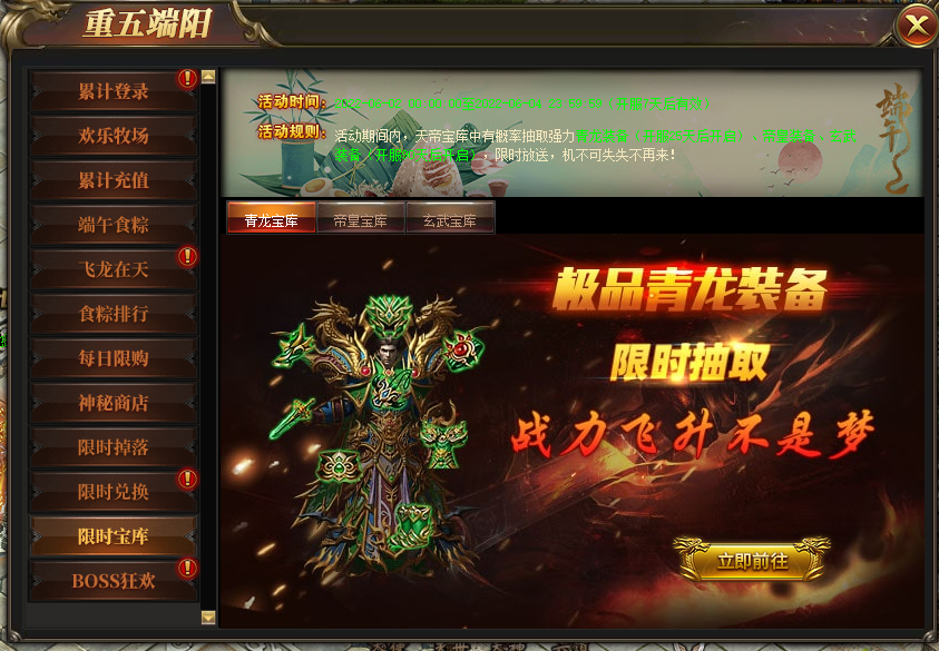 活动期间内,天帝宝库中有概率抽取强力青龙装备(开服25天后开启)、帝皇装备、玄武装备(开服90天后开启),限时放送,机不可失失不再来!