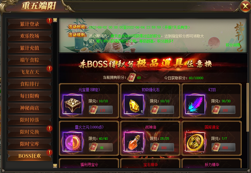 活动期间内,每天击杀BOSS可获得对应的积分,达到指定积分即可领取大奖!每个BOSS获得的积分不同,等级越高,积分越多!