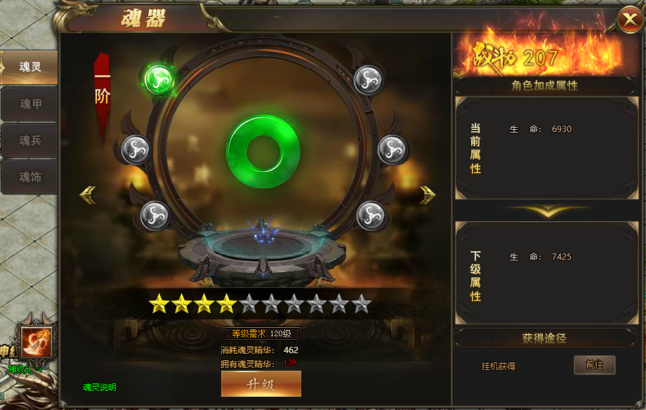 魂器系统中有魂灵、魂甲、魂兵、魂饰4个部分,通过收集对应精华可以提升等阶获得属性