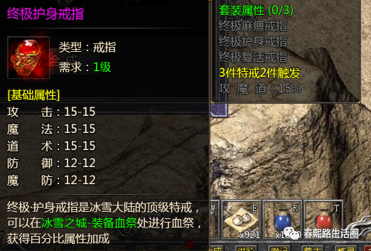终极·护身戒指是冰雪大陆的顶级特戒可以在冰雪之城-装备血祭处进行血祭获得百分比属性加成。