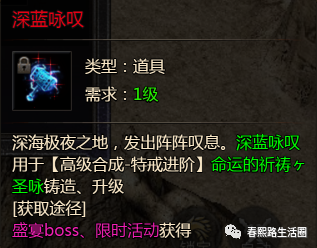 深海极夜之地,发出阵阵叹息。深蓝咏叹用于【高级合成-特戒进阶】命运的祈祷ケ圣咏铸造、升级