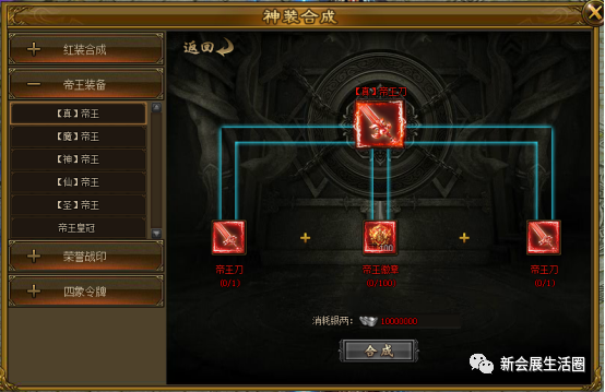 消耗任意帝王装备、帝王徽章与一定银两可合成随机【真】帝王装备