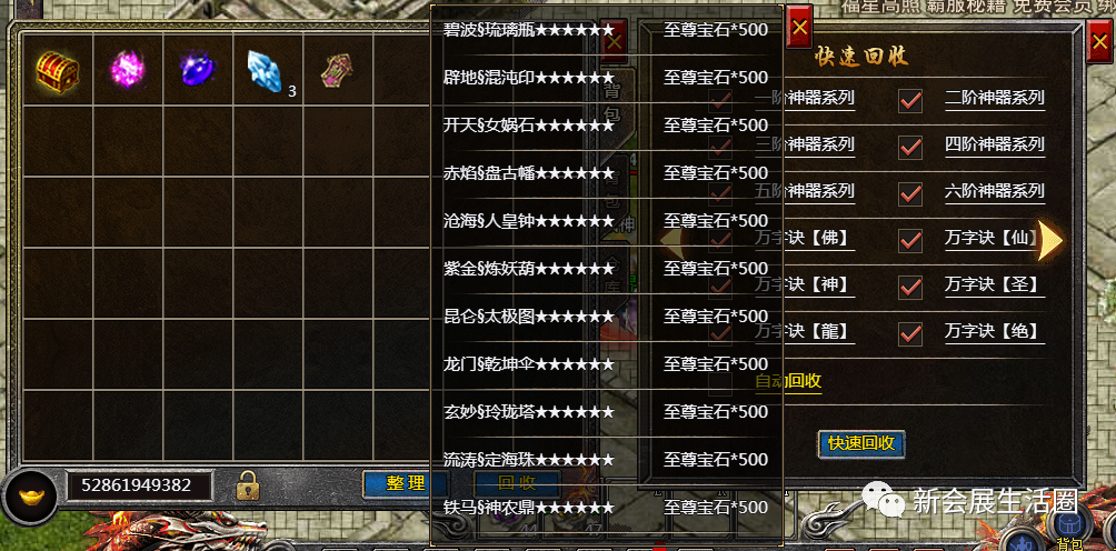 进入到背包或找到装备回收NPC,进入到回收界面,并切换到第4页的回收界面,可找到神器的回收。大家只需勾选对应阶级范围的神器,即可快速选择符合要求的神器回收。目前,系统只提供1-6阶的神器回收功能,因此,大家在合成神器时,记得看清楚不要合成重复的高阶神器,避免回收不了哦。