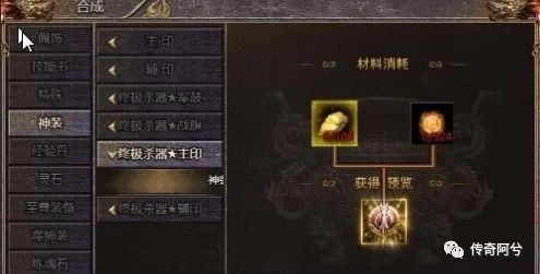 热血传奇页游传奇霸主开服70天玩家可以在合成-神装-终极杀器★辅印,合成终极杀器,玩家之前的主印可在分解-神装中,分解成等量的荣誉之魂炼化材料可在声望商城中购买。