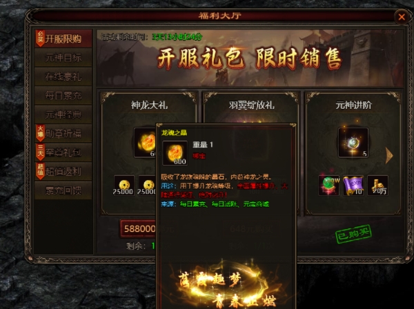 开服活动:把握开服活动中的三次限购礼包,获取大量元宝和龙魂之晶。