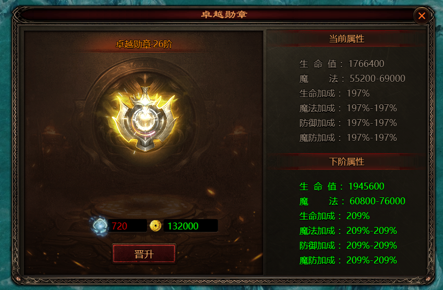 勋章属性包括生命值、攻击/魔法/道术、各类加成比例等,全面提升角色实力。