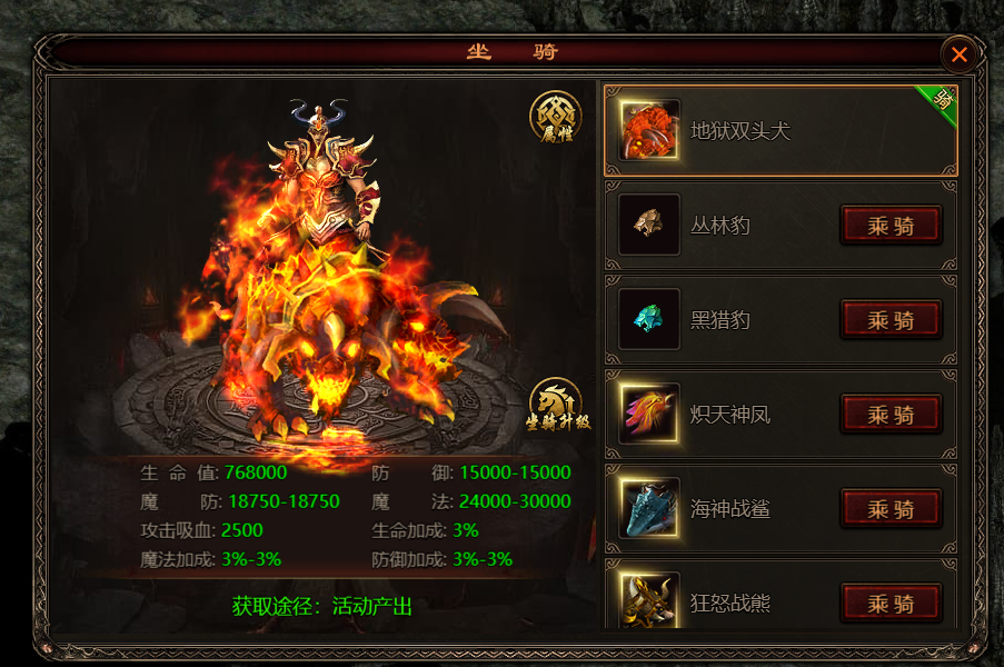 每日礼包:购买特技坐骑宝箱,有较高概率获得丛林豹坐骑。