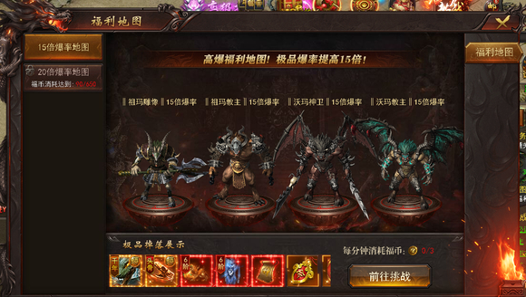 15倍爆率地图每分钟消耗3个福币,累计消耗650福币后可开启20倍爆率地图。