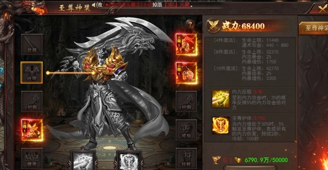 至尊神装共有8个部位,包括头盔、项链、戒指、手镯、腰带、鞋子、衣服和裤子。集齐这些装备不仅能激活技能“内力反噬”和“至尊护体”,还能根据装备的阶数获得不同的属性提升。