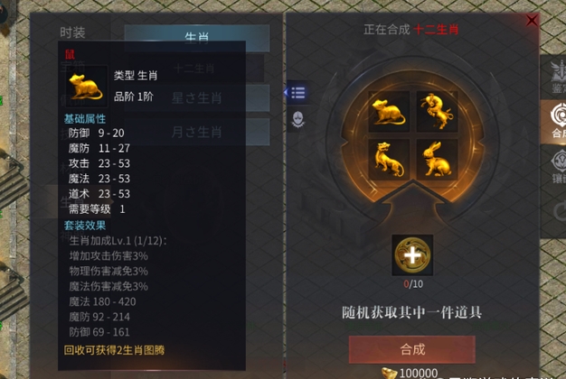 活动礼包:通过参与游戏内活动和开启礼包,有机会获得生肖装备或合成材料。