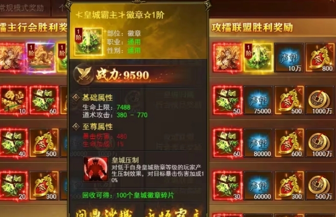 回收皇城徽章和龙印时,玩家将分别获得100个皇城徽章碎片和龙印碎片,这些碎片可用于装备的升级或兑换。