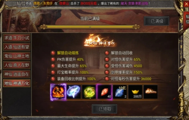 顶赞仙位:作为游戏的核心特色,仙位系统提供了极高的加成。特别是地仙级别,不仅能增加伤害和战力,还能提高打怪爆率和剑甲爆率,非常值得追求。