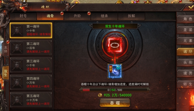 吞噬魂环或魂骨:通过吞噬对应等级的魂环、魂骨或双生经验丹,为双生魂环增加经验进度。