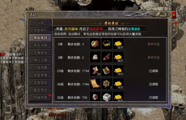 等级奖励:达到50级并完成一转后,可以领取斗笠奖励;达到二转可以领取技巧项链和勋章等,这些装备在新区前期作用重大。