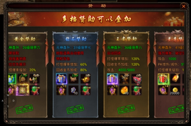 在《四圣封神》传世元神版中,提升打怪爆率是玩家们快速成长的关键。以下是如何通过激活不同级别的赞助来提高你的游戏爆率的详细攻略。