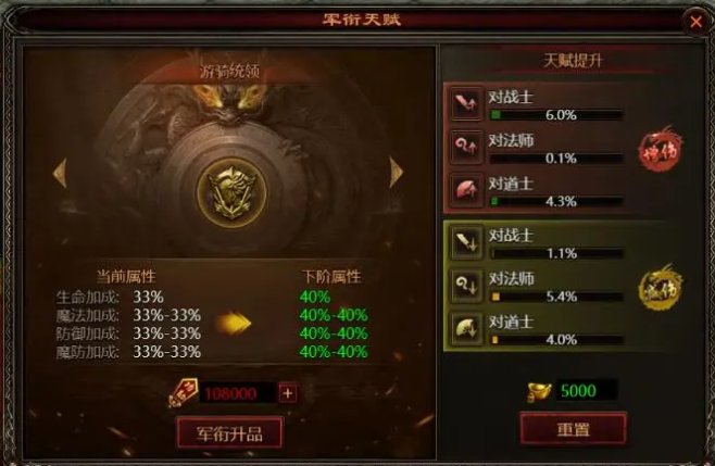 除了基础属性外,军衔系统还允许玩家消耗材料或元宝提升天赋,以获得对不同职业的抵抗或增伤效果,这在PvP战斗中尤为关键。