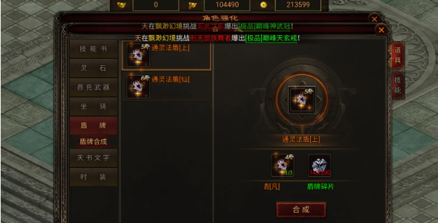 大家要想提升盾牌等级,可以收集相应的盾牌碎片和通宝的材料,可以在合成系统里,合成更高级的盾牌。对于盾牌碎片的获取,我们可以通过挑战各种BOSS,会有概率掉落低阶的盾牌,回收低阶盾牌即可获得一些盾牌碎片的。