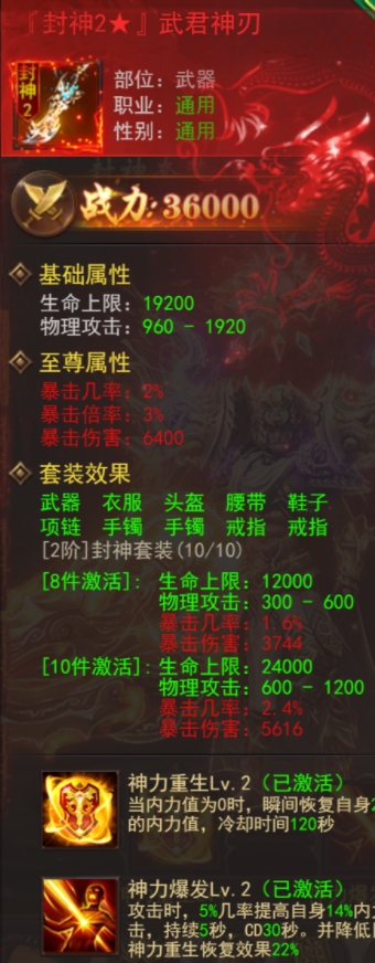 封神套装的核心属性在于内力回复,它不仅能够加快战斗中的内力值恢复,还能增加暴击几率和暴击伤害。套装中的两大技能“神力重生”和“神力爆发”为战斗提供了额外的续航和攻击优势。