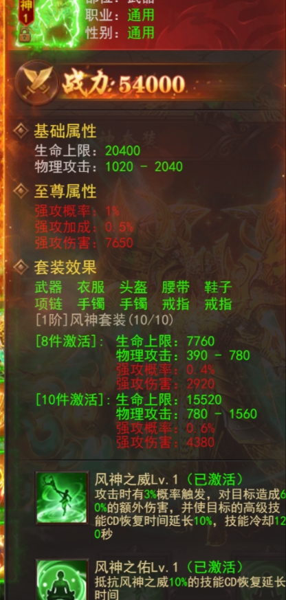 风神套装以辅助控制为主,能够延长敌人的技能冷却时间,并增加强攻属性。