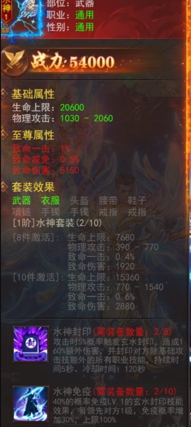 水神封印:攻击时概率触发,造成160%的额外伤害,并封印对方所有职业技能(除基础攻击外),持续5秒。
