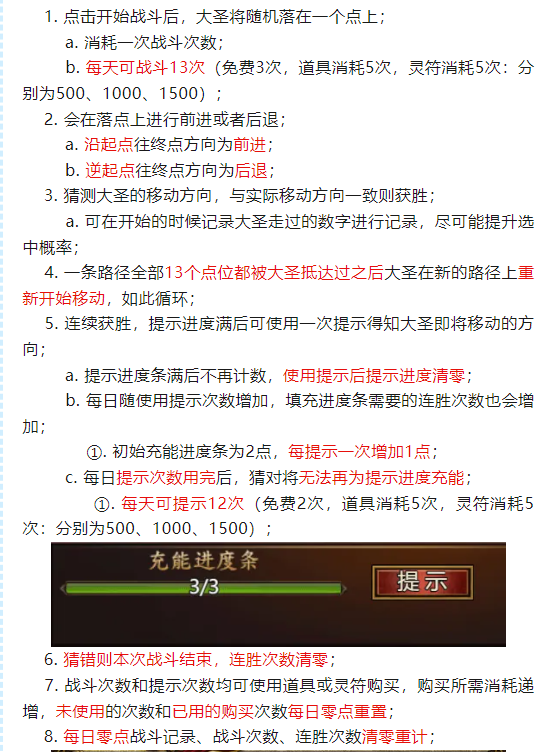 连续获胜后,进度满可使用一次提示得知大圣即将移动的方向,每天可提示12次(免费2次,道具消耗5次,灵符消耗5次)。