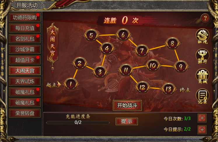每位玩家每天有13次战斗次数(免费3次,道具消耗5次,灵符消耗5次)。