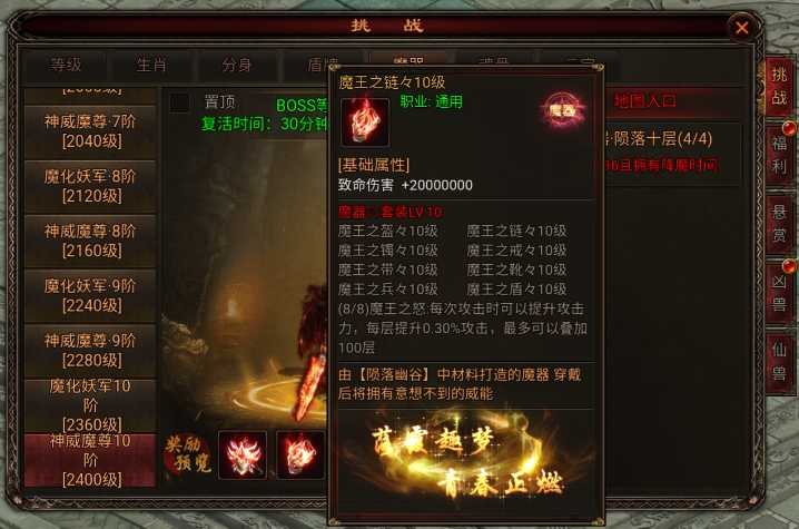 玩家需要达到龙魂19阶才能进入魔器地图。地图中的BOSS每半小时刷新一次,击败BOSS有机会获得魔器装备。魔器地图共有十层,每提升两阶龙魂之力,玩家可以进入下一层进行探险。