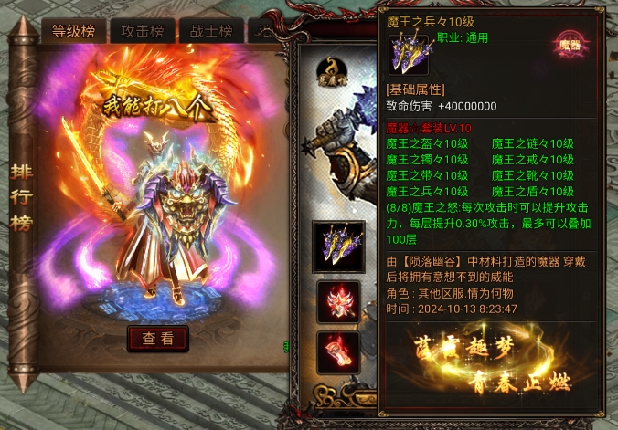 当玩家闯荡至第十大陆时,魔器系统将解锁。一整套魔器共有八件,装备后可激活套装效果,每次攻击都能提升攻击力的一定百分比,显著增强战斗力。