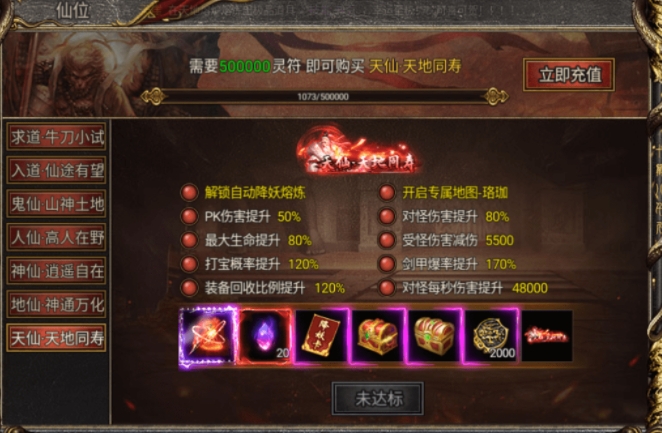 开启仙位后,接下来要开启狂暴之力。这是一个无论什么仙位都必备的功能。它能显著提升你的打怪爆率20%,对怪物增伤10%,同时最大生命值提升100%,让你在战斗中更加强大。