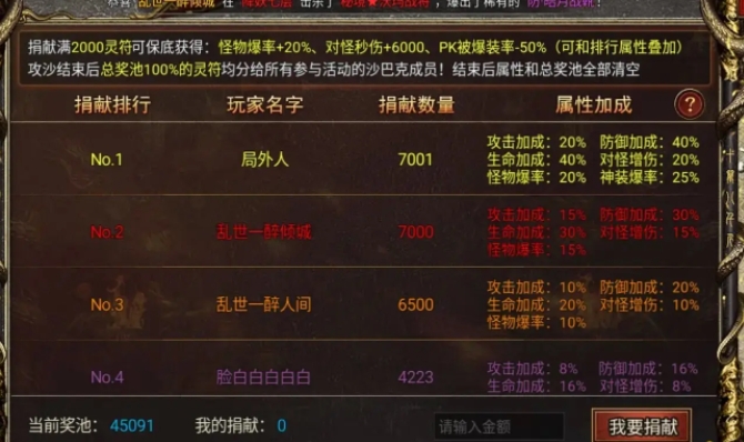 沙捐是提升战力的重要途径。保底捐献2000元宝,你将获得怪物爆率增加20%,免爆率提升50%,以及每秒对怪物增伤提升6000的额外收益。