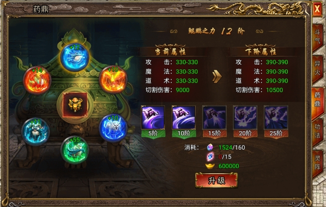 在《上古战歌》中,药鼎内蕴含六种强大神兽的力量:鲲鹏之力、凤凰之力、穷奇之力、霸下之力、饕餮之力、麒麟之力。这些力量对玩家的战斗力有着显著的提升作用。