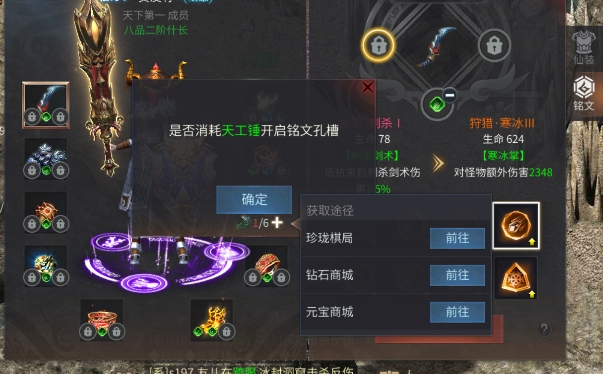 装备需要消耗天工锤打孔后才可镶嵌铭文,天工锤可在玲珑棋局或商城获得。