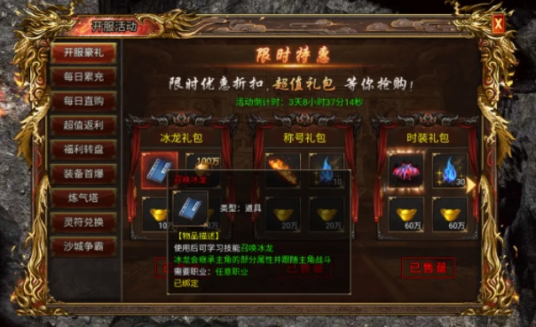 开服活动:在游戏开服的前三天,玩家可以通过充值3000元获得一个4品信物,这是获取冰龙的第一步。