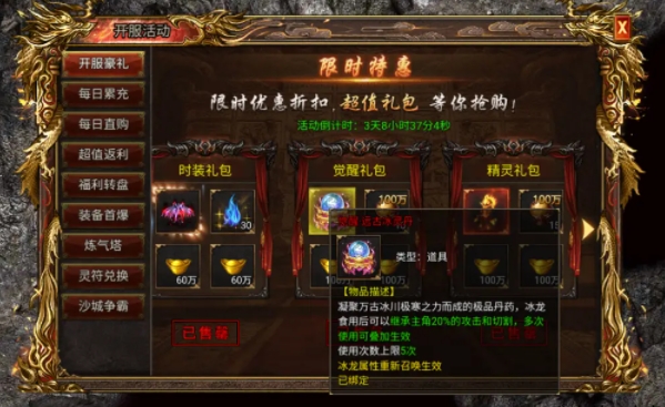 觉醒礼包:在开服豪礼界面中,玩家可以找到觉醒礼包,内含远古冰灵丹,这枚丹药能让冰龙继承主角属性,并可叠加服用,从而提升冰龙的战力。