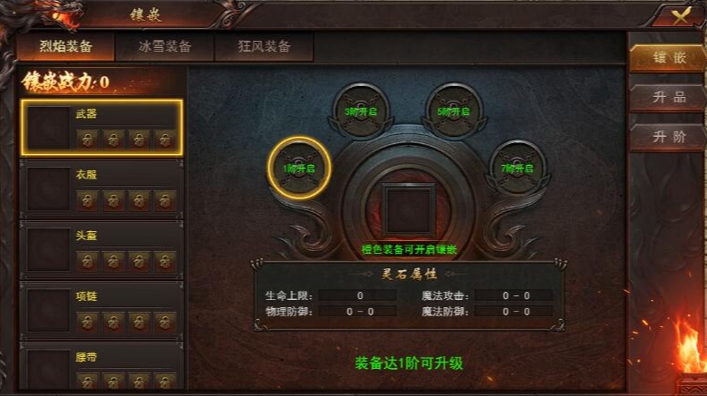 橙色装备的1、3、5、7阶可以镶嵌灵石,提升装备属性和战斗力。