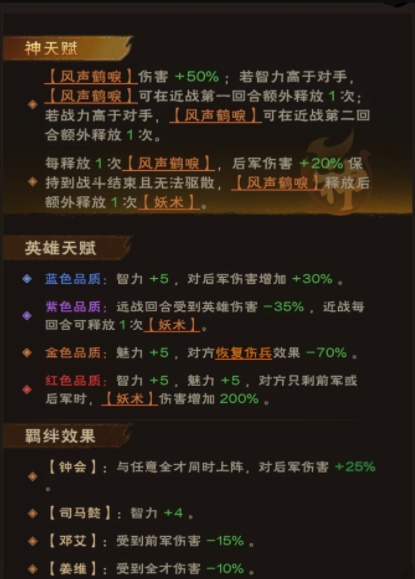 核心技能:风声鹤唳提供50%的伤害加成,是钟会输出能力的重要保障。