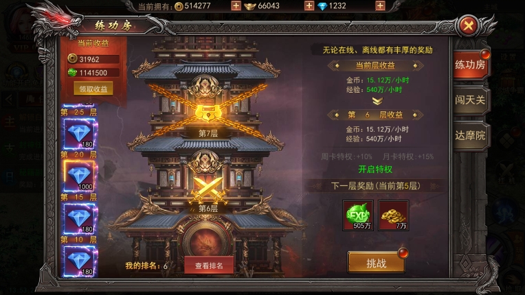 练功房是《君临传奇》中获取巨额经验的重要途径。每通关一关,玩家都能获得上千万的经验值,而且通关的层数越高,经验收益越大。此外,练功房的通关层数还能提升玩家的挂机收益,让你在离线时也能获得可观的经验和资源。需要注意的是,想要挑战更高层的镇妖塔,提升翅膀等级是关键。建议玩家优先升级翅膀,以便在练功房中走得更远。