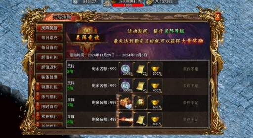 灵阵礼包是提升灵阵等级的重要资源之一。通过购买灵阵礼包,玩家可以获得大量的灵阵材料,快速提升灵阵等级,解锁更强大的属性加成。值得注意的是,灵阵礼包的购买时间有限制,玩家需要在开区135天内完成购买,否则将失去机会。