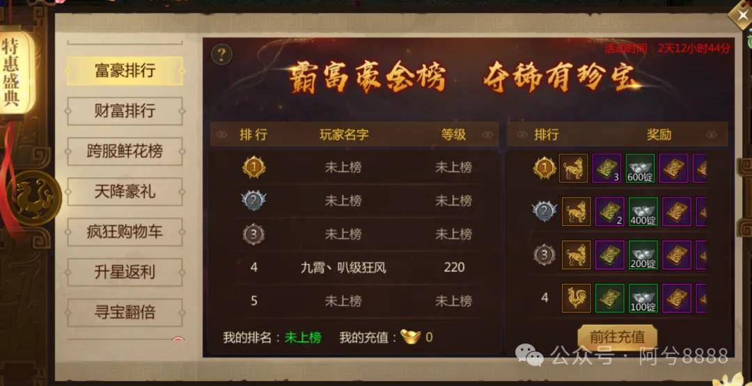 - 玩家充值满 **30 锭金子** 即可参与富豪排行活动。