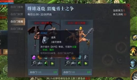 白日门猎魔:白日门猎魔任务的BOSS爆率较高,但有数量限制。如果被其他玩家击杀,需要等待20分钟BOSS才会复活。建议在有体力值时优先击杀BOSS,因为BOSS不仅会爆出战功令,还会掉落一转装备,前期一转装备非常实用。