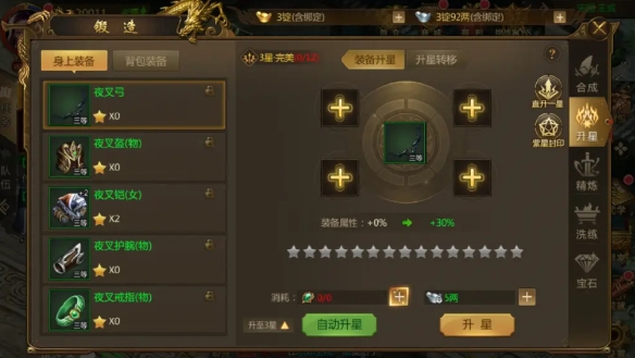 绑银或银子:升星失败时,玩家需要消耗绑银或银子来补偿损失。绑银可以通过游戏内的任务和活动获得,银子则可以通过充值获得。