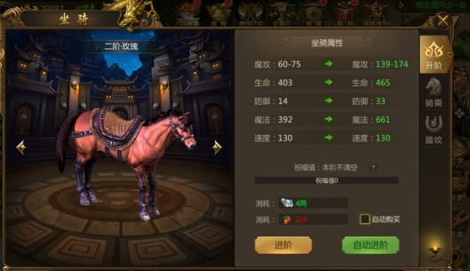 注意:在坐骑升阶时,会有一个祝福值,前4阶祝福值不会被清空,4阶后每日0点清空,千万记得这点,避免产生损失哦!