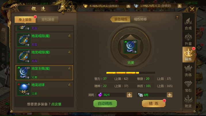 精炼到一定等级后,装备会获得不同的前缀。例如,满精炼后装备会获得“无双”前缀,一半精炼后会获得“完美”前缀。这些前缀不仅提升装备的外观,还能进一步增强装备的属性。